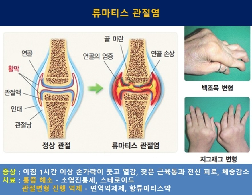 - 자가면역 질환으로, 손가락·손목 관절부터 시작됨
